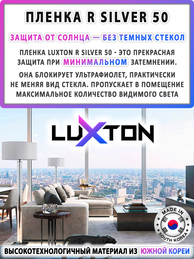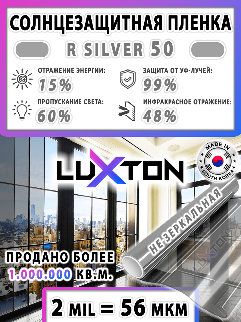 Солнцезащитная пленка LUXTON R SILVER 50 - серебристая пленка с минимальным зеркальным эффектом и светопропускаемостью 60%. Толщина 2 mil = 56 мкм. Зеркальная пленка LUXTON Характеризуется повышенной способностью удерживать солнечные и тепловые лучи.