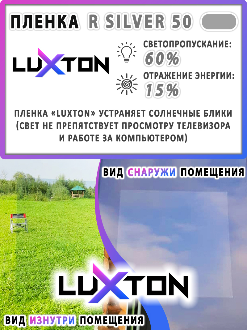 Солнцезащитная пленка LUXTON R SILVER 50 - серебристая пленка с минимальным зеркальным эффектом и светопропускаемостью 60%.  Толщина 2 mil = 56 мкм. Зеркальная пленка LUXTON Характеризуется повышенной способностью удерживать солнечные и тепловые лучи.
