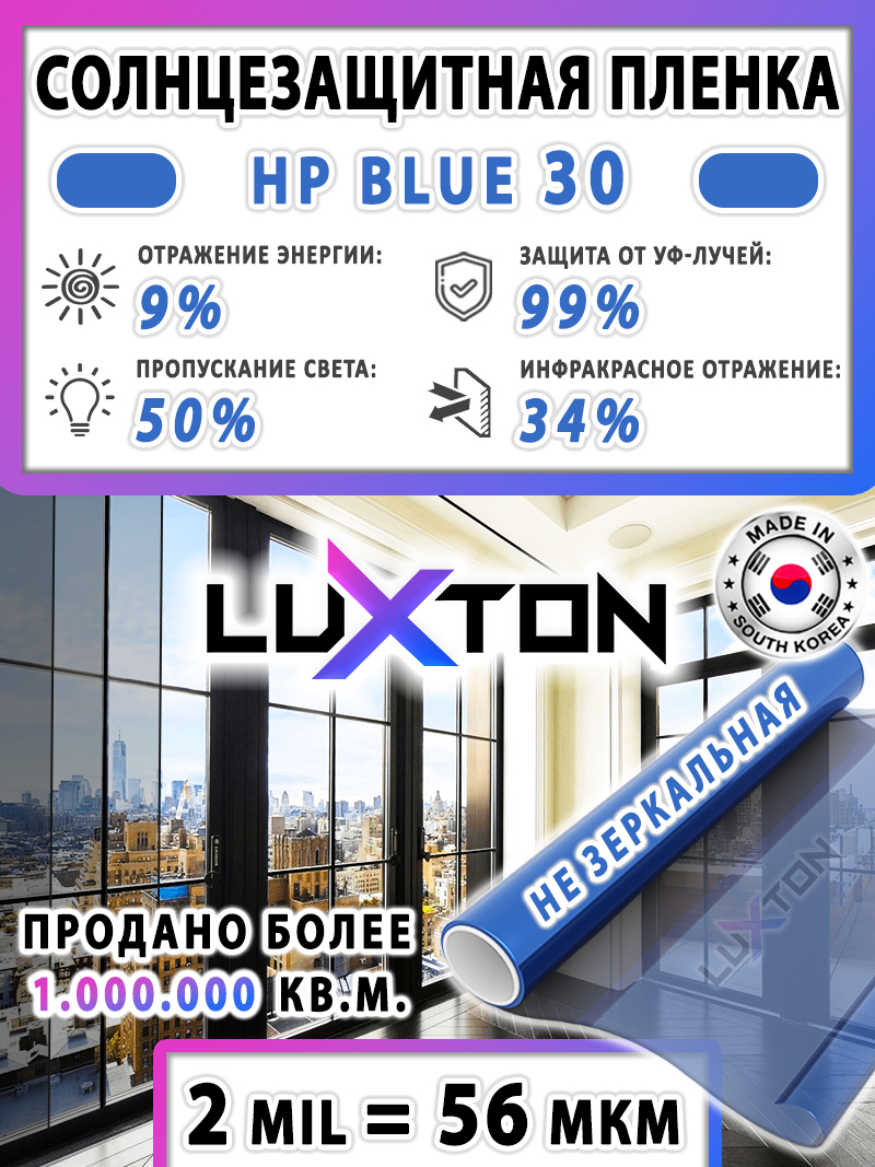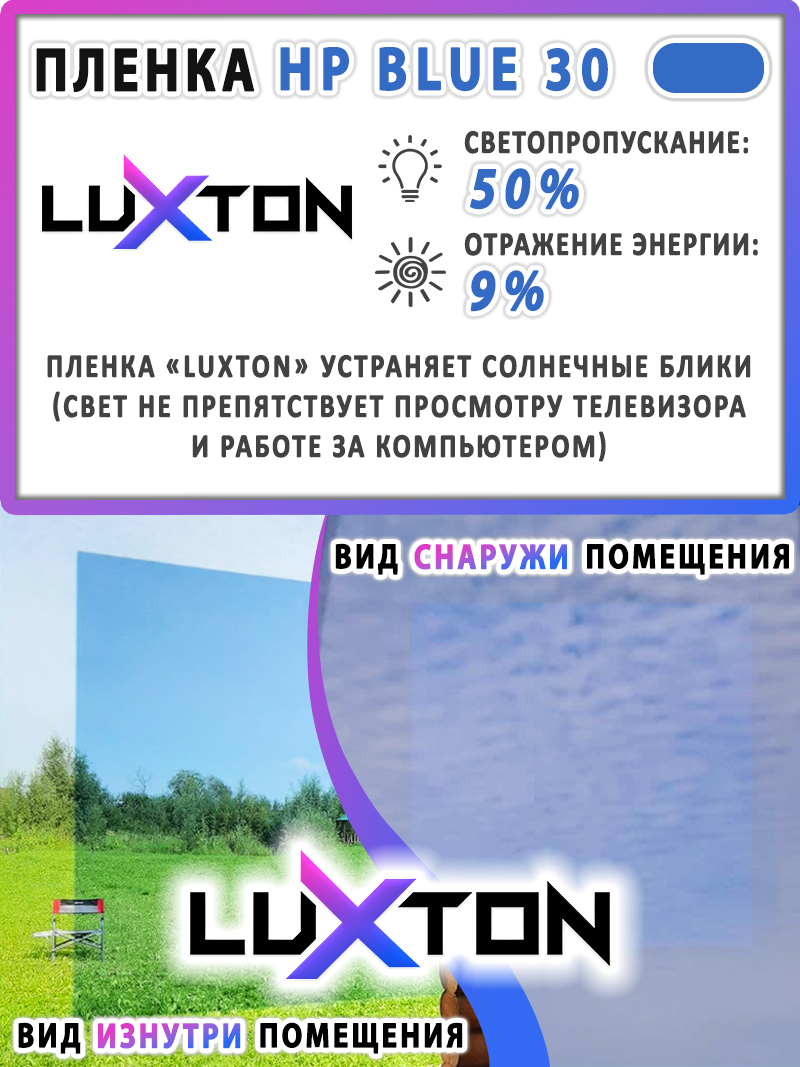 Солнцезащитная пленка LUXTON HP BLUE 30 - синяя пленка без зеркального эффекта и светопропускаемостью 50%. Толщина 2 mil = 56 мкм. Тонировочная пленка LUXTON Характеризуется повышенной способностью удерживать солнечные и тепловые лучи.