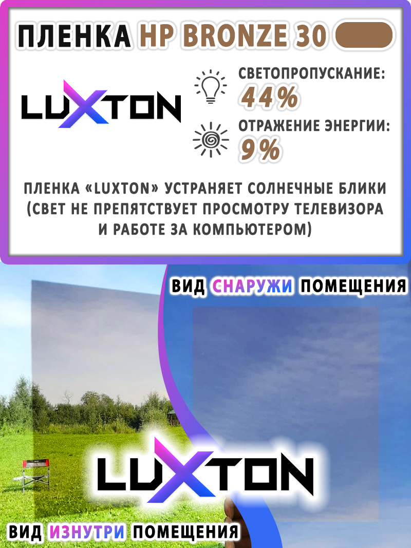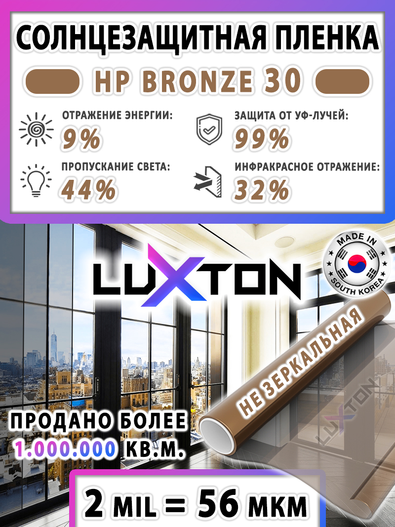 Солнцезащитная пленка LUXTON HP BRONZE 30 - бронзовая пленка без зеркального эффекта и светопропускаемостью 44%. Толщина 2 mil = 56 мкм. Тонировочная пленка LUXTON Характеризуется повышенной способностью удерживать солнечные и тепловые лучи.