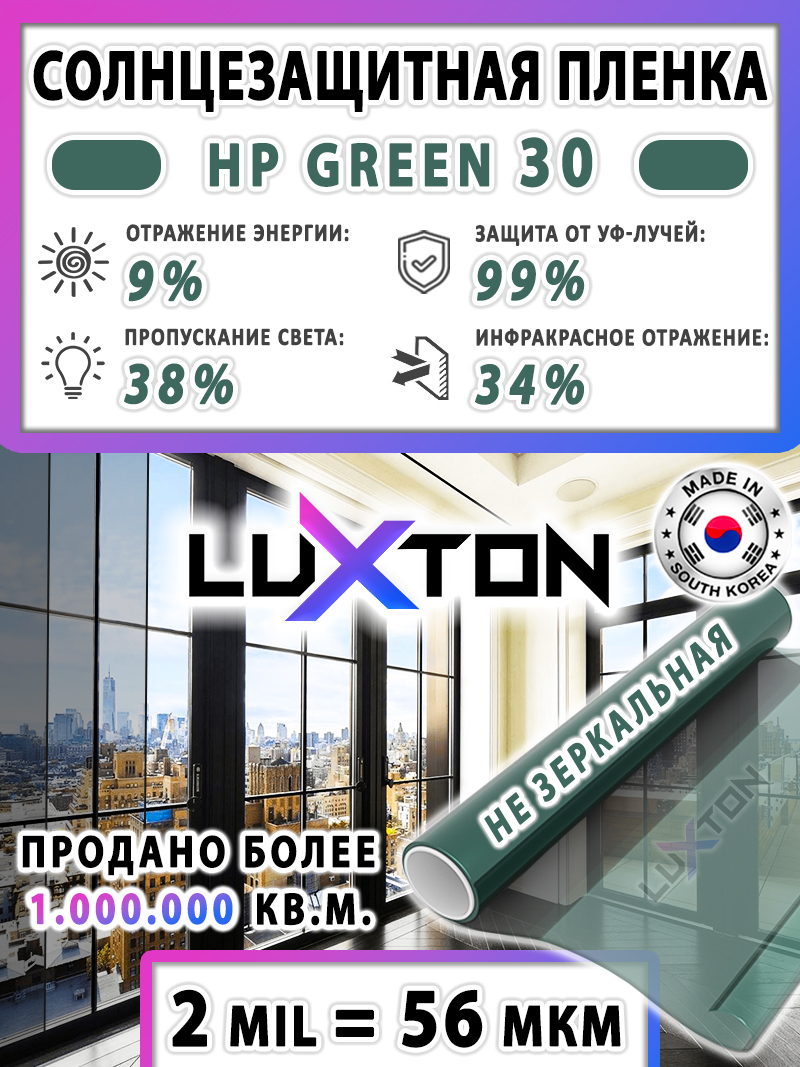 Солнцезащитная пленка LUXTON HP GREEN 30 - зеленая пленка без зеркального эффекта и светопропускаемостью 38%. Толщина 2 mil = 56 мкм. Тонировочная пленка LUXTON Характеризуется повышенной способностью удерживать солнечные и тепловые лучи.