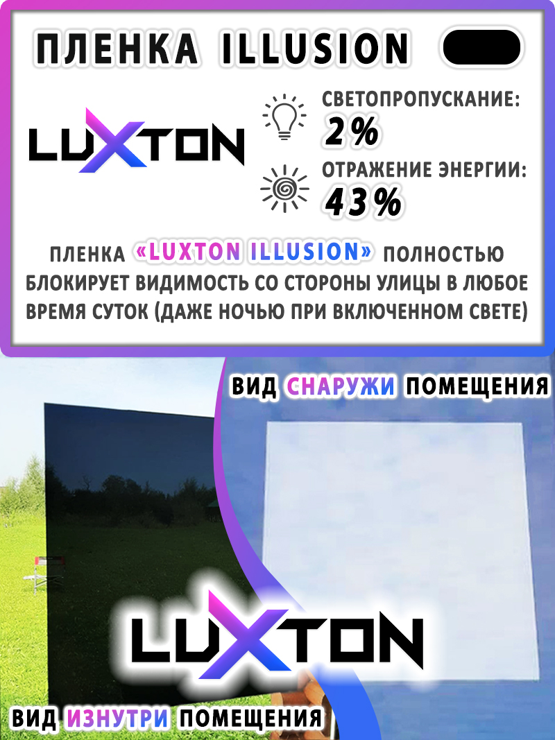 В тех случаях, когда нужна полная защита от посторонних глаз и в светлое и в ночное время суток при включенном свете, мы рекомендуем рассмотреть глухую зеркальную пленку LUXTON ILLUSION, которая имеет практически полностью одностороннюю видимость и даже при включённом свете. Она полностью обеспечивает приватность в любое время суток при включенном или выключенном освещении. Светопропускание пленки LUXTON ILLUSION составляет 2%.