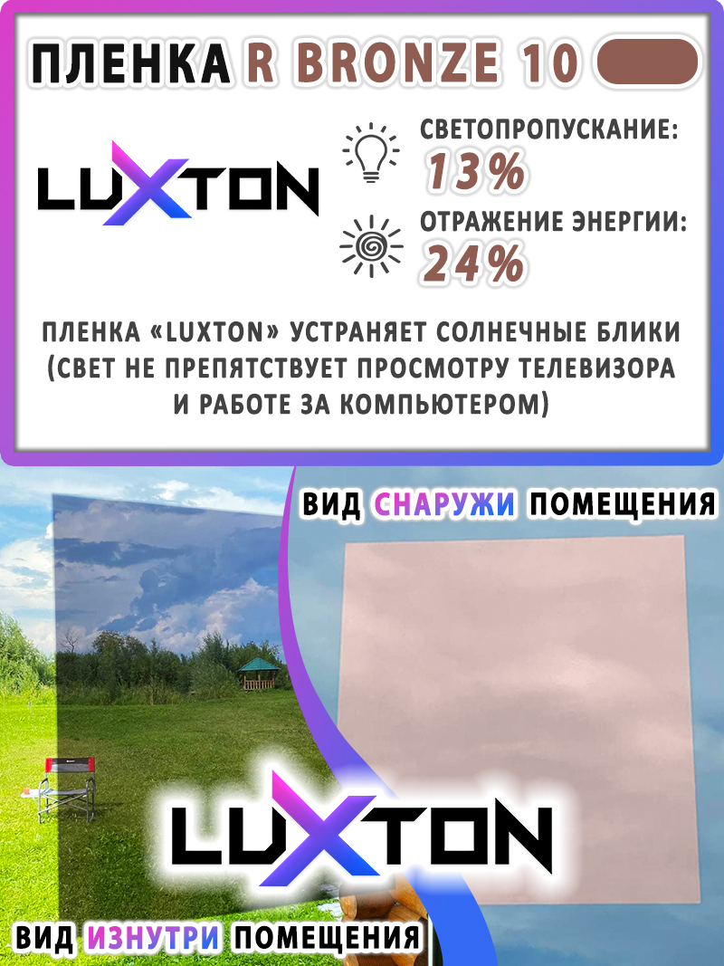 Солнцезащитная пленка LUXTON R BRONZE 10 - бронзовая пленка с зеркальным эффектом и светопропускаемостью 13%.  Толщина 2 mil = 56 мкм. Зеркальная пленка LUXTON Характеризуется повышенной способностью удерживать солнечные и тепловые лучи.