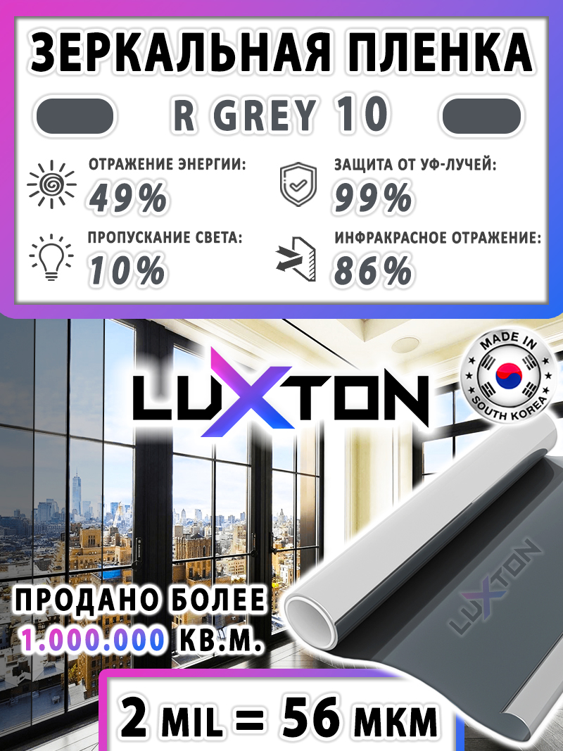 Солнцезащитная пленка LUXTON R GREY 10 - серая пленка с зеркальным эффектом и светопропускаемостью 10%.  Толщина 2 mil = 56 мкм. Зеркальная пленка LUXTON Характеризуется повышенной способностью удерживать солнечные и тепловые лучи.