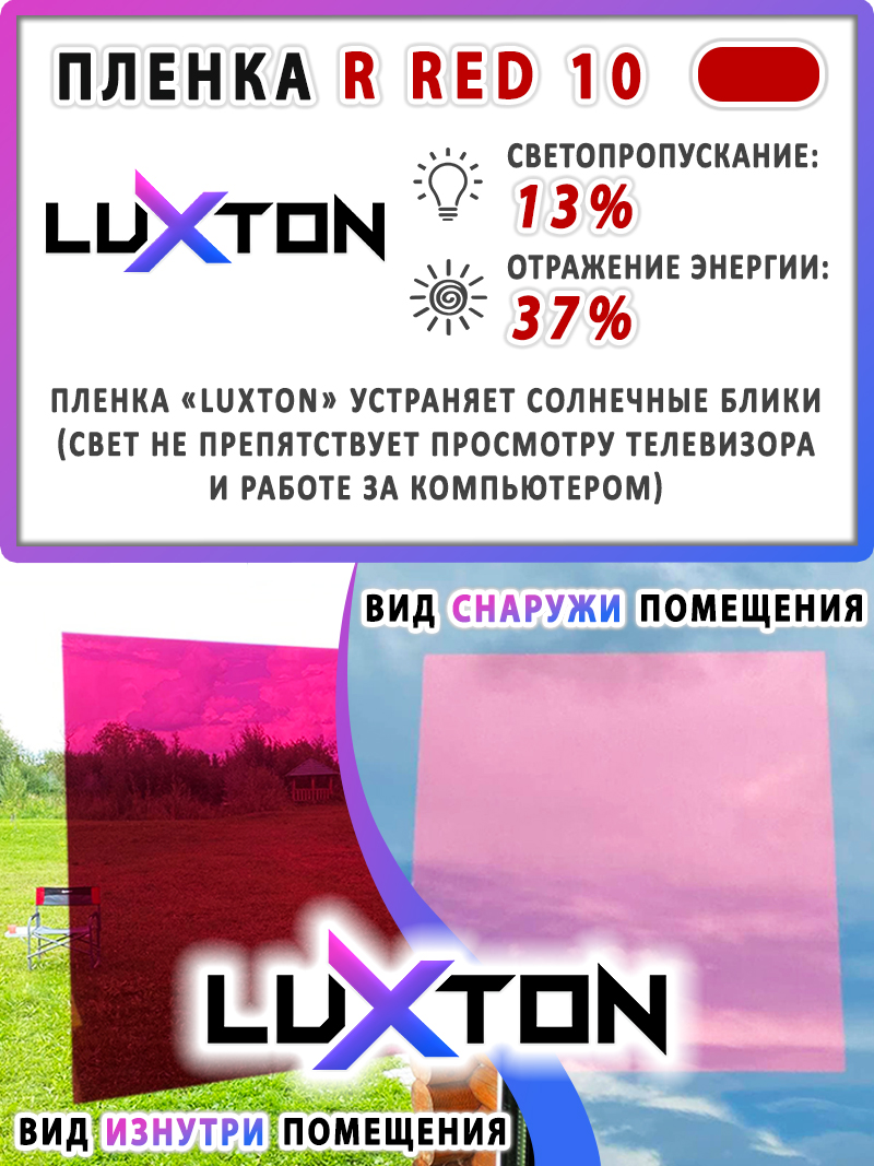 Солнцезащитная пленка LUXTON R RED 10 - красная пленка с зеркальным эффектом и светопропускаемостью 13%.  Толщина 2 mil = 56 мкм. Зеркальная пленка LUXTON Характеризуется повышенной способностью удерживать солнечные и тепловые лучи.