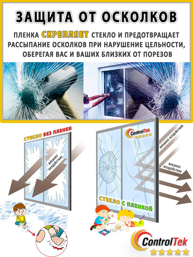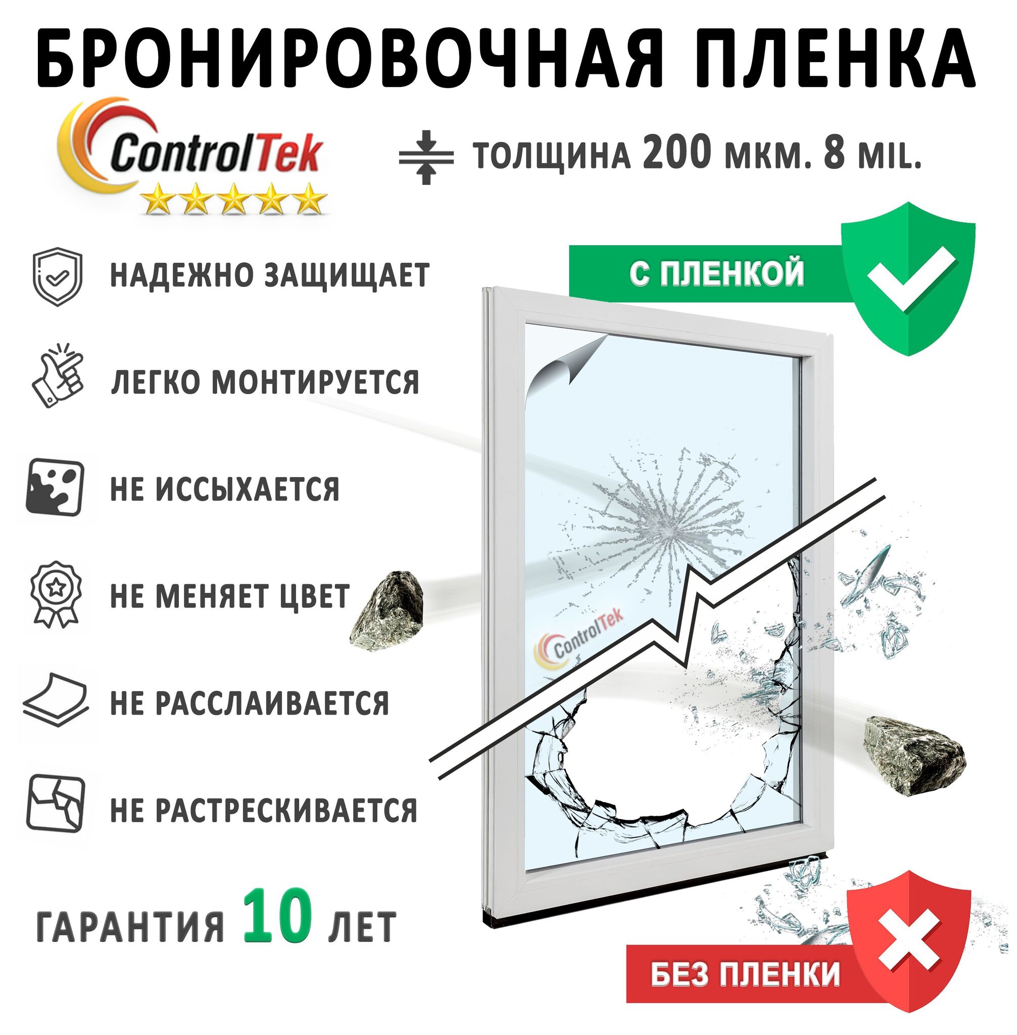 Бронировочная пленка ControlTek предназначена для защиты стекла и стеклянных изделия от механических повреждений. Защитная пленка придает стеклу противоосколочные свойства. Изготовлена из высокотехнологичного и качественного материала.