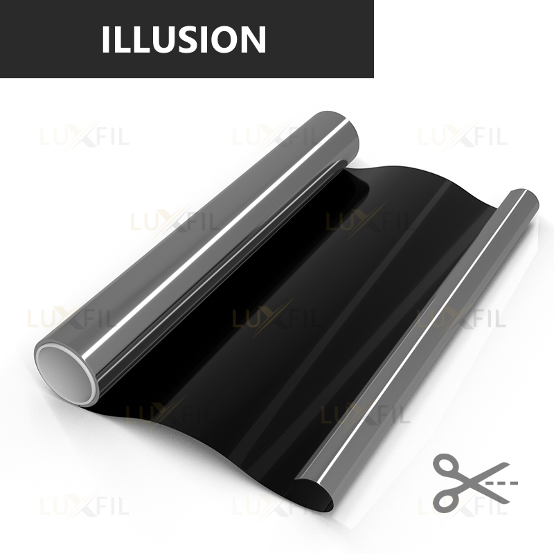 Пленка солнцезащитная для окон, пленка зеркальная для окон LUXFIL ILLUSION - cнаружи cеребристая, изнутри черная пленка с зеркальным эффектом. Светопропускаемость 2%. Толщина 2 mil = 56 мкм. Характеризуется повышенной способностью удерживать солнечные и тепловые лучи. Почти как зеркало.