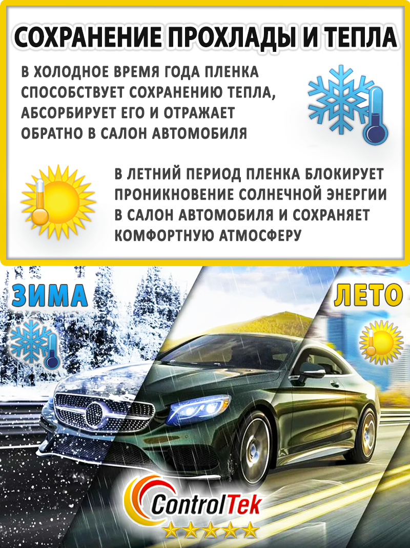 Пленка для окон ControlTek создает комфортные условия для нахождения в автомобиле. Она отражает солнечную энергию и препятствует нагреву от солнца, создавая комфортный климат внутри помещения.